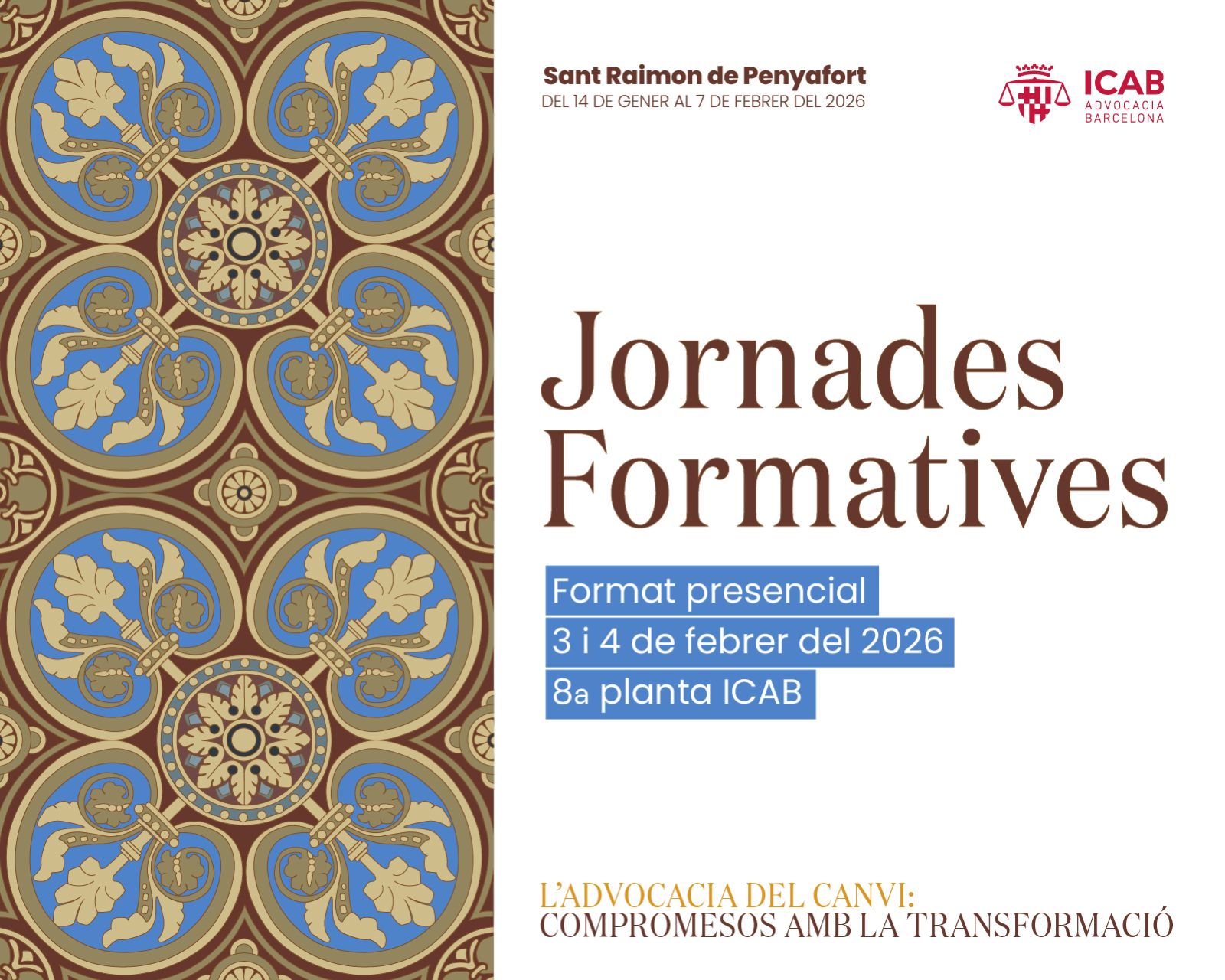 Els dies 3 i 4 de febrer de 2026 tindran lloc les Jornades Formatives de Sant Raimon de Penyafort 2026, en format presencial, a la 8a planta de l’ICAB. Les jornades formen part del projecte de la Junta de Govern "12 Congressos, 12 Causes" i estaran vinculades a l'ONG "DEBRA Piel de Mariposa".