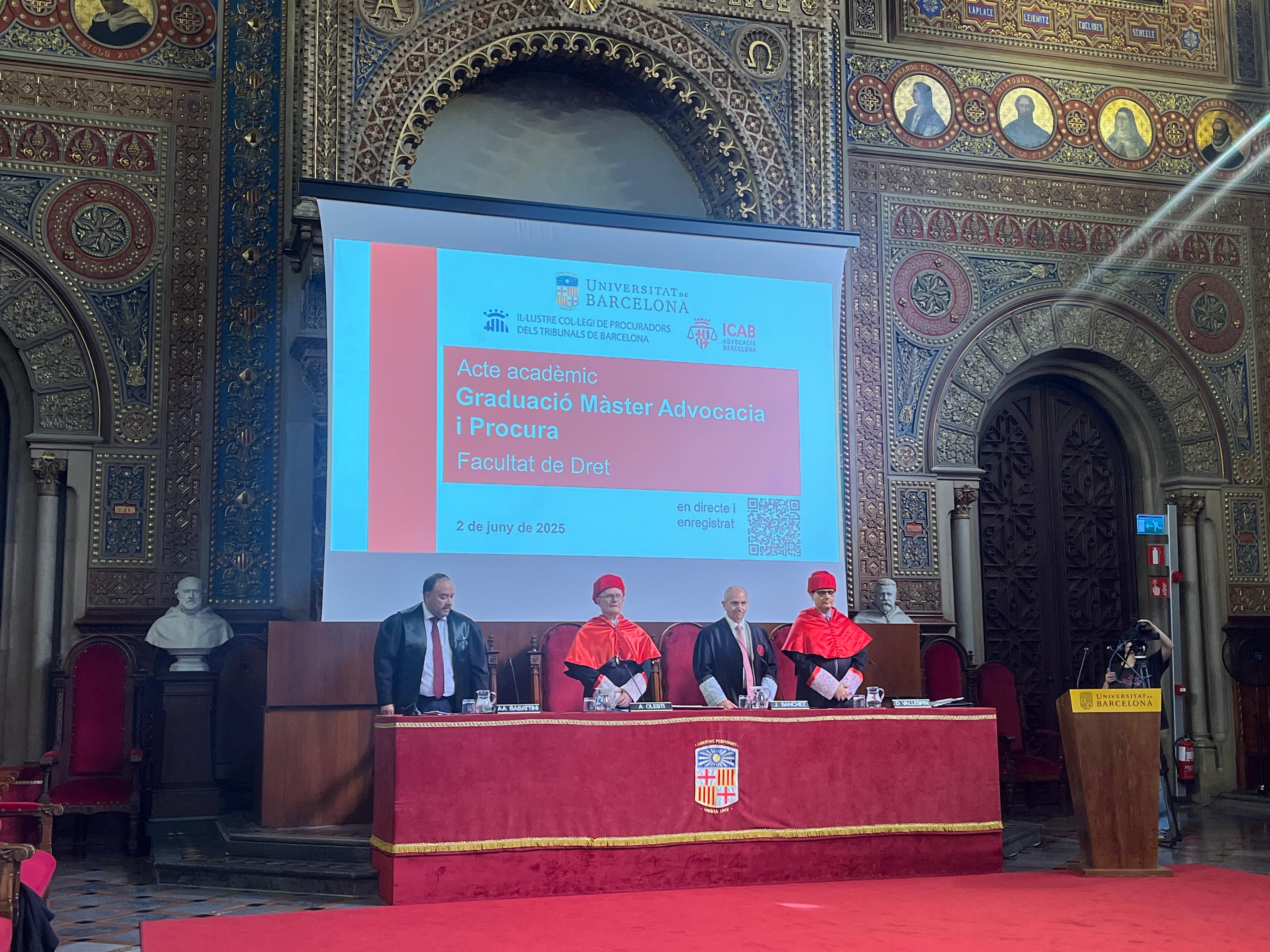 Ahir, dilluns 2 de juny de 2025, el Paranimf de l’Edifici Històric de la Universitat de Barcelona (UB) va acollir l’acte solemne de final d’estudis de la promoció 2025 del Màster en Advocacia i Procura. Entre les autoritats convidades, hi va destacar la participació de Jesús M. Sánchez García, degà de l’Il·lustre Col·legi de l’Advocacia de Barcelona (ICAB), qui va intervenir en la cerimònia amb un discurs adreçat als nous graduats.