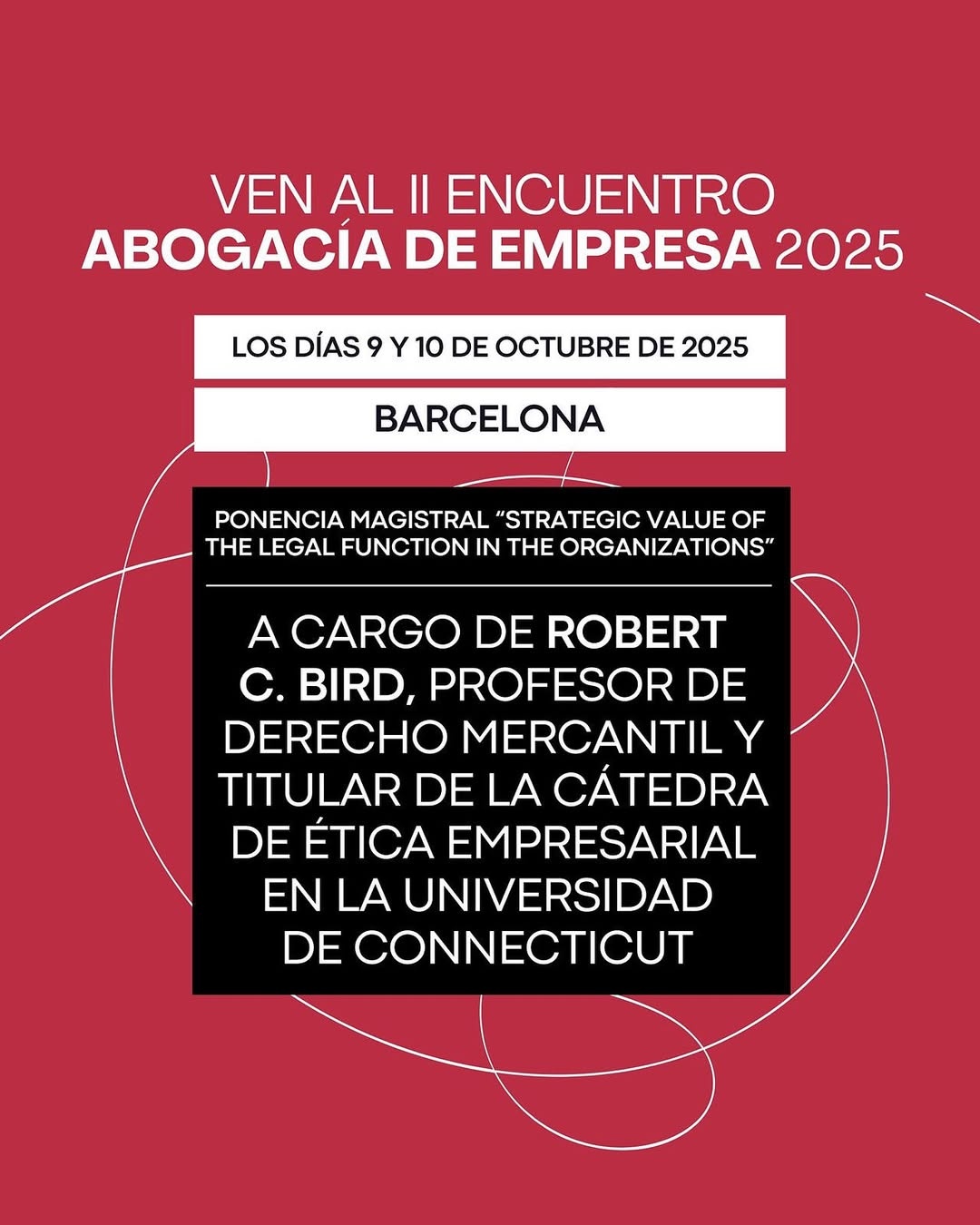 La Trobada s’iniciarà amb una ponència magistral a càrrec de Robert C. Bird, autor de Legal Knowledge in Organizations: A Source of Strategic and Competitive Advantage, i figura clau en l’anàlisi de la funció legal com a avantatge competitiu. La seva intervenció marcarà el to estratègic d’aquest esdeveniment.