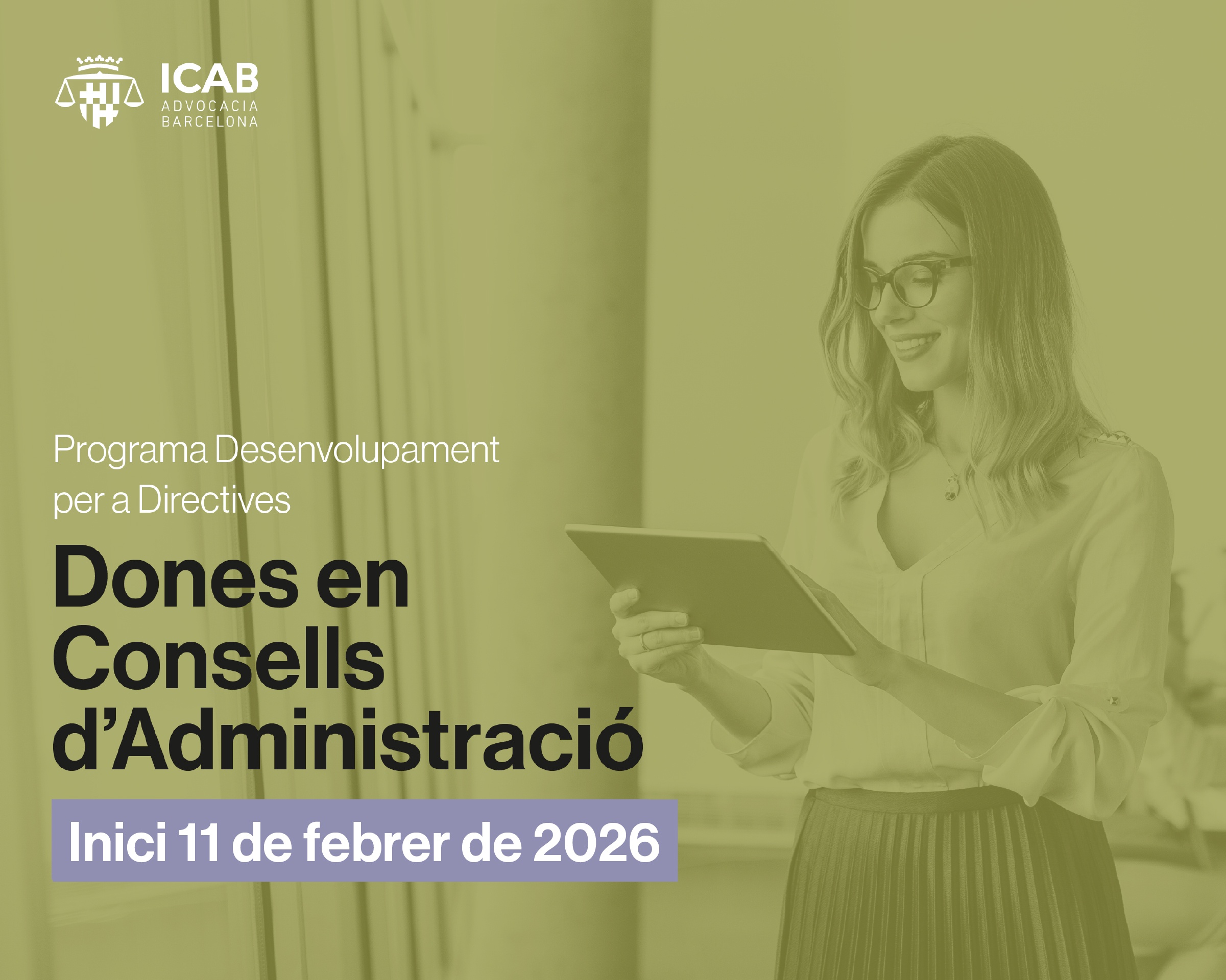 El Col·legi de l’Advocacia de Barcelona impulsa una nova edició del Programa desenvolupament per a directives. Dones en Consell d'Administració, dirigit a advocades, llicenciades i graduades que vulguin consolidar coneixements i competències per formar part d’un Consell d’Administració de manera eficaç i incorporar les noves perspectives de la dona consellera d'empresa.
