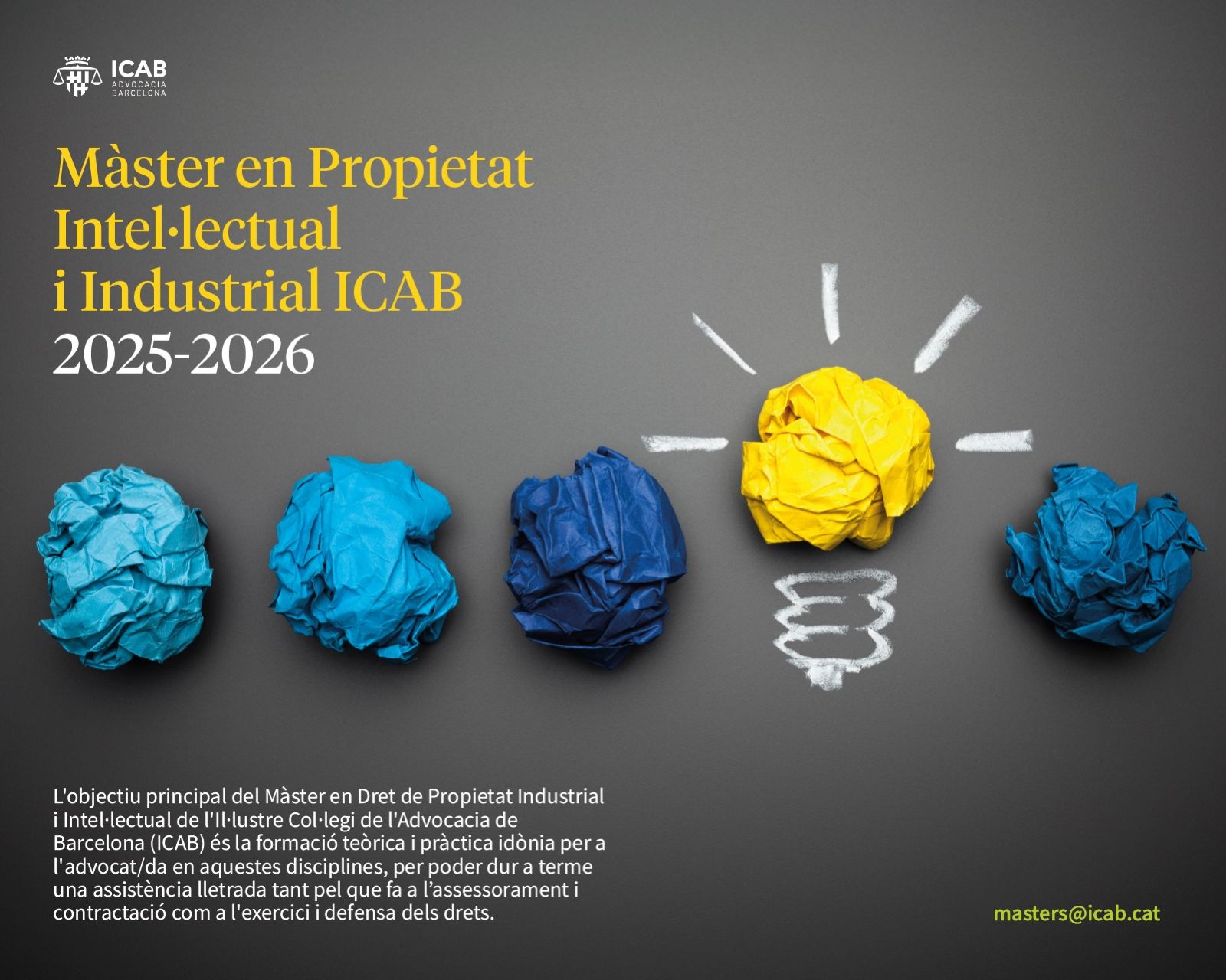La protecció de les creacions intel·lectuals; la protecció de les modalitats distintives de la propietat industrial; els dissenys industrials; la competència deslleial; les patents i altres invencions; així com els mecanismes processals de Protecció dels Drets de la Propietat Industrial i Intel·lectual són els eixos principals del Màster en Propietat Intel·lectual i Industrial que organitza l'Il·lustre Col·legi de l’Advocacia de Barcelona (ICAB). Matrícula oberta fins al 9 d'octubre de 2025!