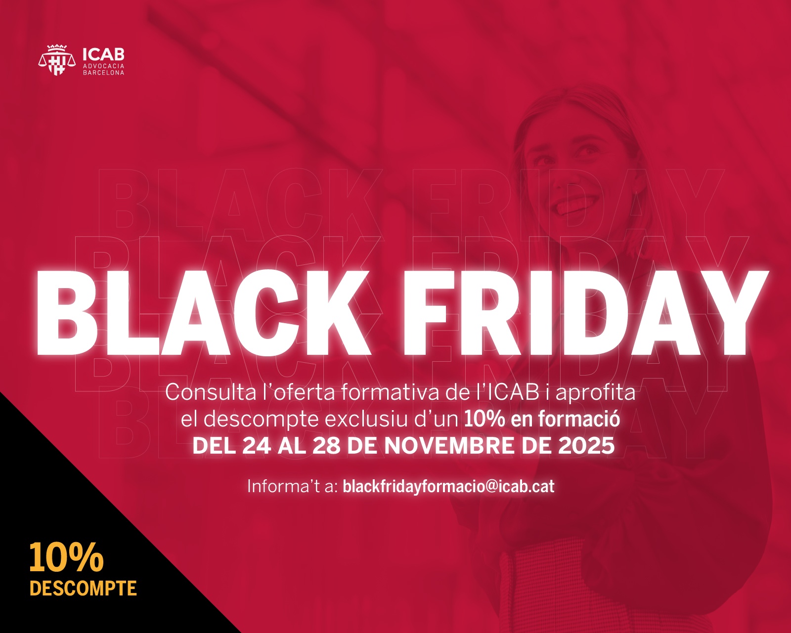 Arriba una promoció que no et pots perdre! A l’ICAB t’oferim facilitats per formar-te amb nosaltres: durant la setmana del 24 al 28 de novembre de 2025, aprofita el nostre descompte Black Friday del 10% en tota la nostra oferta formativa.