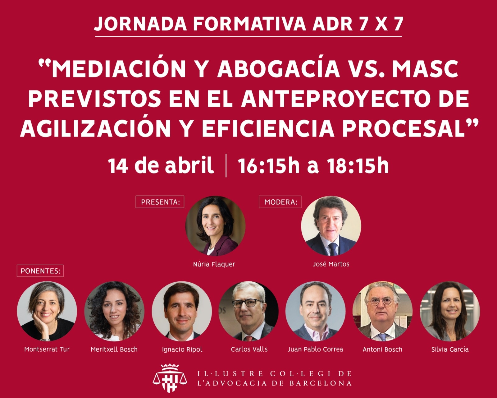La presente jornada, organizada por el Centre ADR del Il·lustre Col·legi de l’Advocacia de Barcelona y la Comissió d’Advocats/des Mediadors/es, tiene como objetivo dar a conocer diferentes ámbitos de la mediación y tratará la posible incorporación de temas como el Derecho Colaborativo o la Coordinación de Parentalidad al Anteproyecto de Agilización y Eficiencia Procesal.