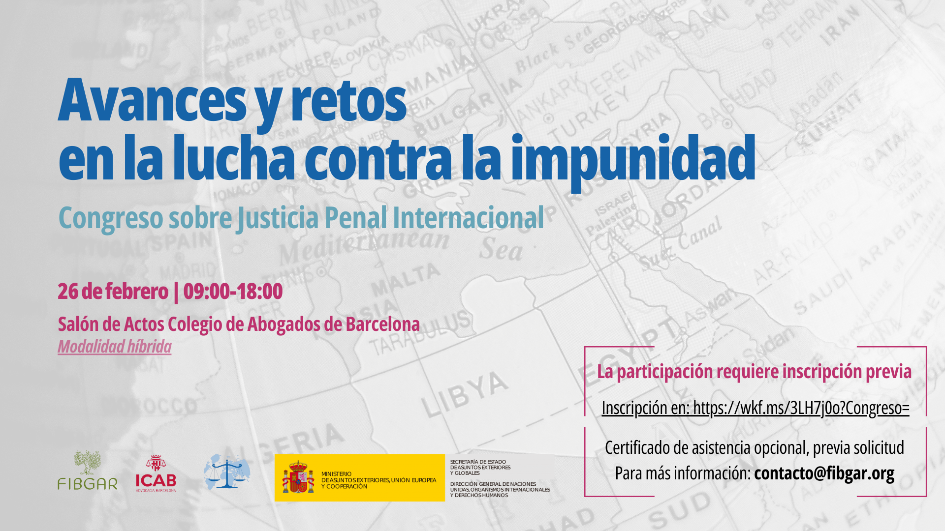 La Fundación Internacional Baltasar Garzón (FIBGAR) y la Comisión de Justicia Penal Internacional y Derechos Humanos del Ilustre Colegio de la Abogacía de Barcelona (ICAB) organizan la jornada de formación "Avances y retos en la lucha contra la impunidad"