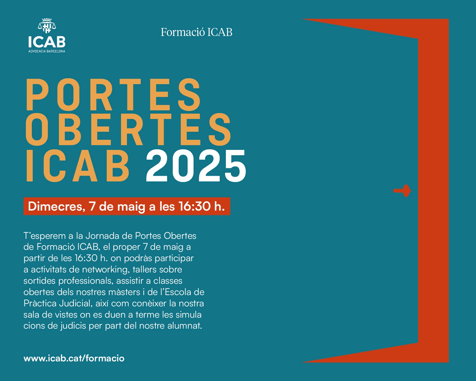 El Ilustre Colegio de la Abogacía de Barcelona (ICAB) quiere dar a conocer su oferta formativa en Másters y Postgrados de especialización jurídica de la edición 2025-2026 y el Postgrado de Práctica Jurídica que realiza a través de la Escuela de Práctica para iniciarse en el ejercicio práctico de la profesión. Por este motivo, ha organizado una Jornada de Puertas Abiertas que tendrá lugar este miércoles, 7 de mayo de 2025, a partir de las 16.30 h, en el Centro de Formación del ICAB (Mallorca, 281).