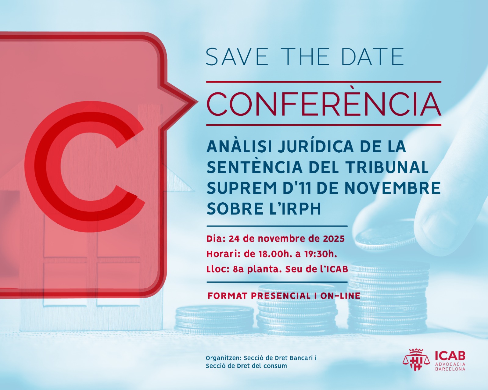 El 24 de noviembre de 2025, a las 18 h, la Sección de Derecho Bancario y la Sección de Derecho de Consumo del ICAB organizan una conferencia para analizar la reciente sentencia del Tribunal Supremo de 11 de noviembre sobre el IRPH.